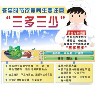 冬至?xí)r節(jié)的飲食還宜多樣化,谷、果、肉、蔬菜要合理搭配,適當(dāng)?shù)剡x用高鈣食品。